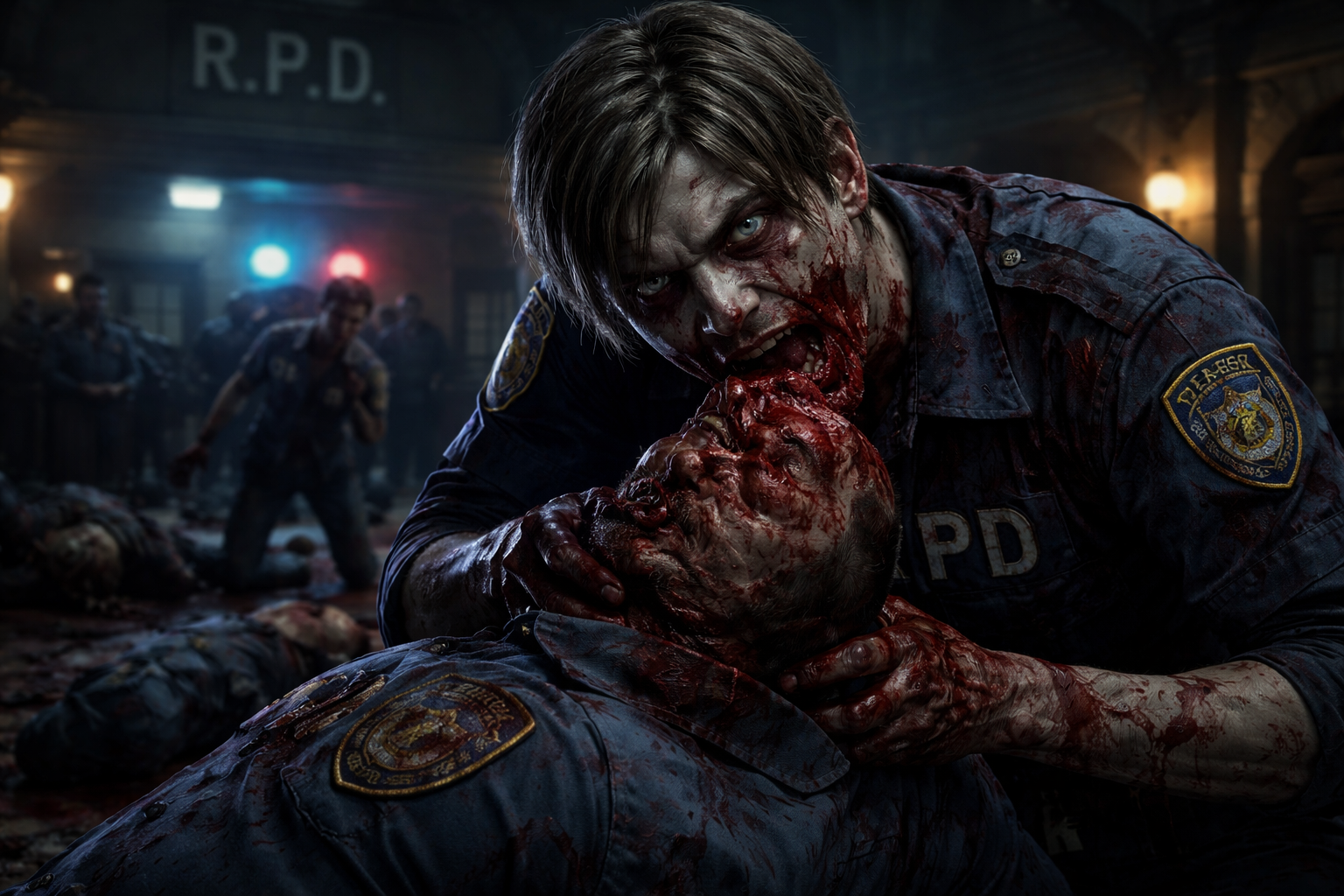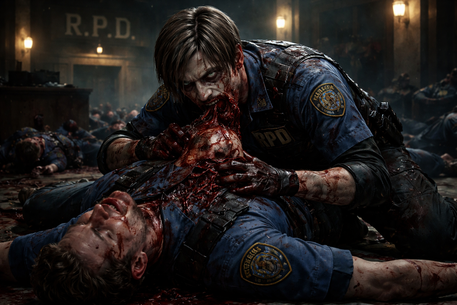 Леон кеннеди стал зомби и поедает полицейских rpd в полицейском участке ракун сити